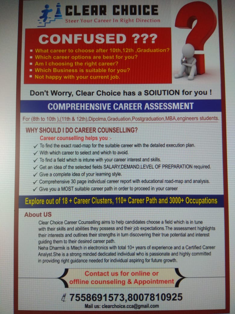 Neha Dharmik, is a highly qualified professional with Mtech in electronics.She has total 8 years experience in teaching and 2 years experience in IT industry.She is a dedicated individual who is highly passionate and committed in providing right guidance needed for the individual aspiring for future growth.She is founder of career choice career counselling which aims at understanding the requirement of the individual and takes utmost care in providing them discover their true potential guiding them to their desired career path.